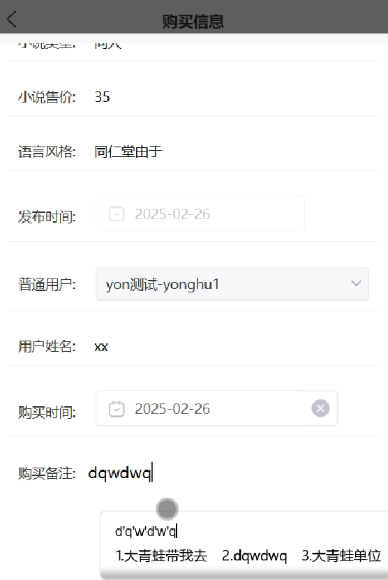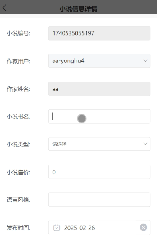 This system adopts WeChat mini program development technology to achieve front-end interaction, and uses the Spring Boot framework to build stable and efficient back-end services. The main functions of this system include: displaying novel information, allowing users to quickly browse the latest works and detailed work introductions; Bookshelf information management enables users to conveniently collect their favorite novels and track their reading progress at any time; Novel information release, providing users with rich content such as industry trends; Novel announcement push, timely conveying system update information to users; The novel purchase service provides support for paid content. Through the integration of these functions, not only has the user experience been enhanced, but a complete business ecosystem has also been built, which is conducive to the interaction between authors and readers, as well as promoting the prosperous development of the online literature market.