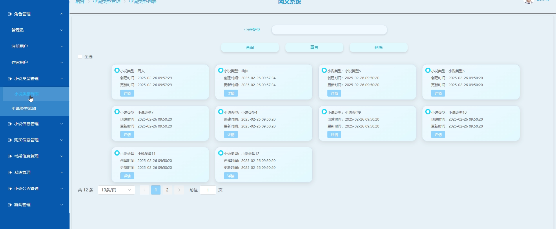 管理员可以通过点击小说类型管理功能,进入操作界面进行类型的新建、修改或删除操作,确保小说分类的准确性和完整性。添加新类型时,管理员可以详细定义其属性,以便更好地对小说进行分类管理;修改或删除操作则可以帮助清理不再适用或错误的分类,保持系统的整洁有序。其界面如下图所示。