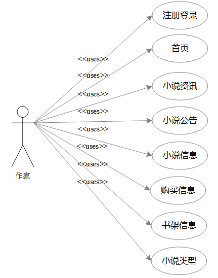 (2)作家功能需求:作家登录前需要先进行注册,完成后需要管理员审核通过方可登录;在小说信息板块允许上传更新小说;购买信息可以查看用户的小说付费订阅详情;书架信息管理各类小说列表添加至书架库;可以浏览小说公告以及小说资讯内容。