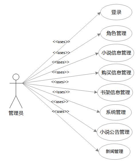 (3)管理员功能需求:管理员通过登录功能进入后台管理系统;管理员可以查看、编辑或删除用户信息;小说类型管理涉及小说分类的设定与调整,便于用户快速定位感兴趣的内容;小说信息管理允许管理员上传新小说、更新小说信息以及维护小说库的整体质量;购买信息可以查看用户的小说付费订阅详情;书架信息管理能使管理员能够创建各类小说列表添加至书架库;小说公告中负责发布公告内容;系统管理包括对轮播图的设置;资源管理则是对系统中最新资讯动态的更新。