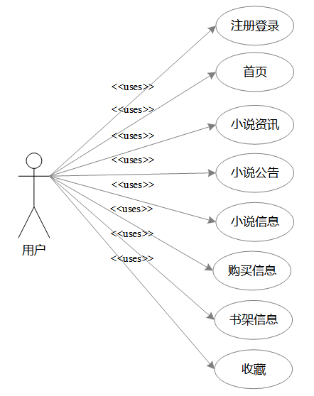 (1)用户功能需求:用户首先通过注册登录功能创建个人账户,从而获得个性化的服务;小说信息可以提供用户海量的小说资源,用户可以进行在线付费阅读;购买信息实现用户订单的查询和支付;小说资讯可以提供用户各种丰富的行业资源动态;系统公告提供最新系统通知内容的发布;最后,个人中心集成了用户个人资料修改、密码登录、收藏列表设置等。