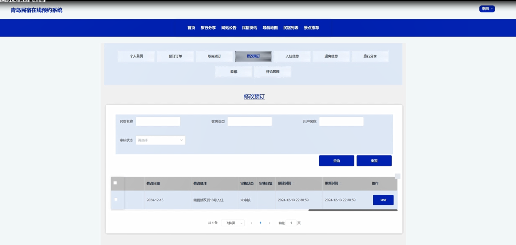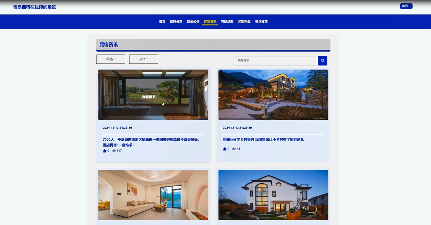 随着旅游业的迅速发展和个性化旅游需求的增长,民宿作为一种独特的住宿选择越来越受到游客的青睐。然而,面对海量的民宿信息,如何高效、准确地找到符合个人喜好的住宿成为一大挑战。为此,本文提出了一个基于Spring Boot框架并采用协同过滤算法的青岛民宿在线预约系统。该系统通过分析用户的历史行为数据(如点击数、收藏等),利用协同过滤算法为用户提供个性化的民宿推荐服务,旨在提升用户体验和满意度。