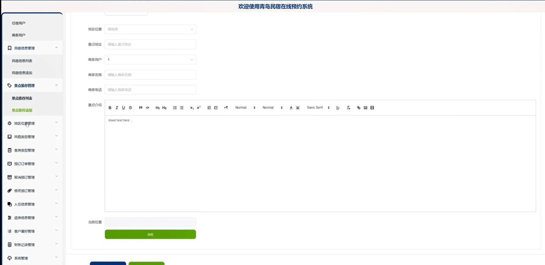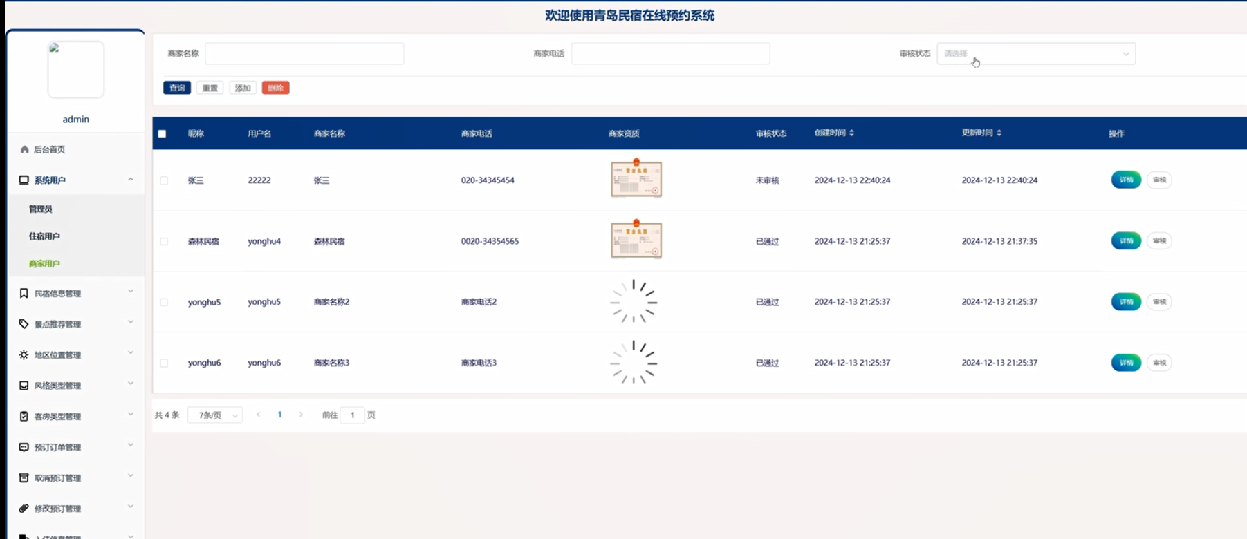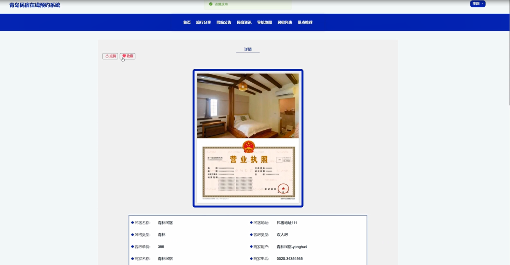 本青岛民宿在线预约系统实现了住宿用户的便捷登录、个人信息管理及丰富的首页展示(轮播图、公告、资讯等),并根据用户点击收藏记录推荐民宿,支持点赞、收藏、评论和预订操作。商家用户可进行注册登录、民宿信息管理和预订信息查看,便于业务维护。管理员负责后台管理,包括用户信息管理、民宿分类与信息审核、预订处理、景点推荐管理,确保系统稳定运行和服务质量。