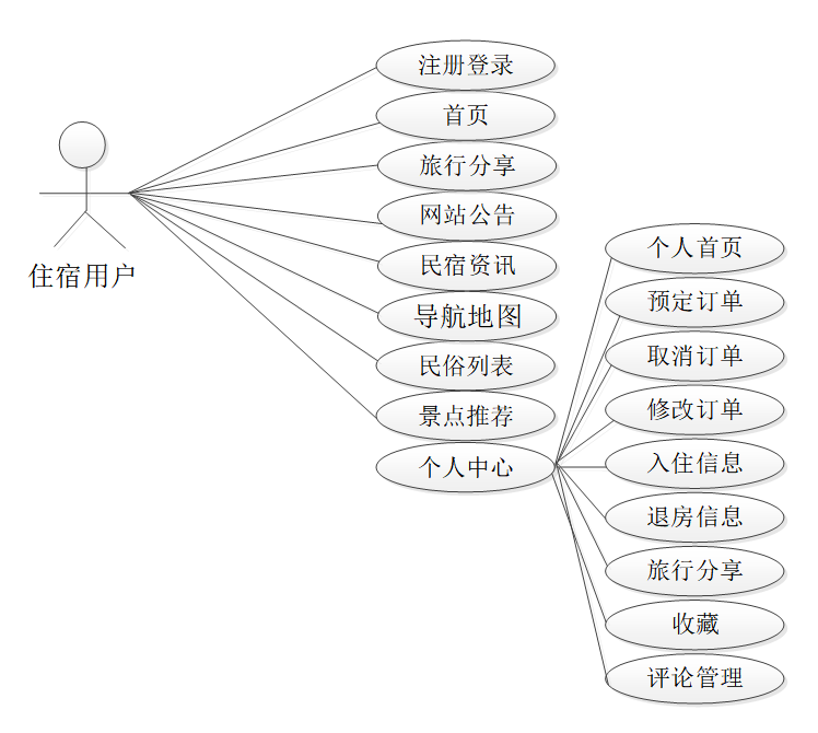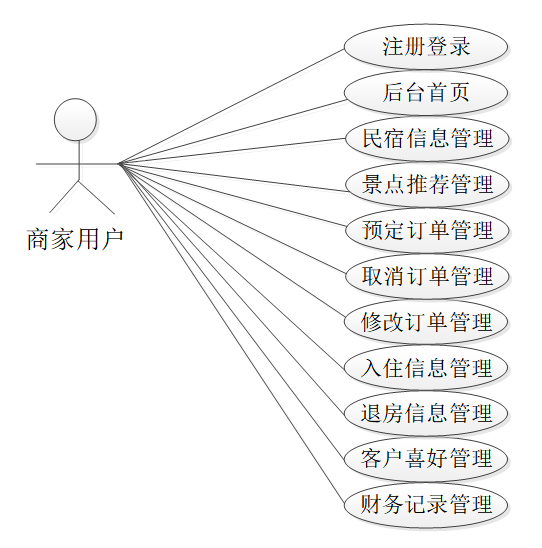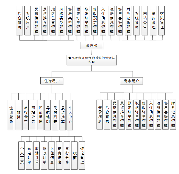 本系统分为住宿用户、商家用户和管理员这三大用户模块,各用户模块的具体功能说明如下: