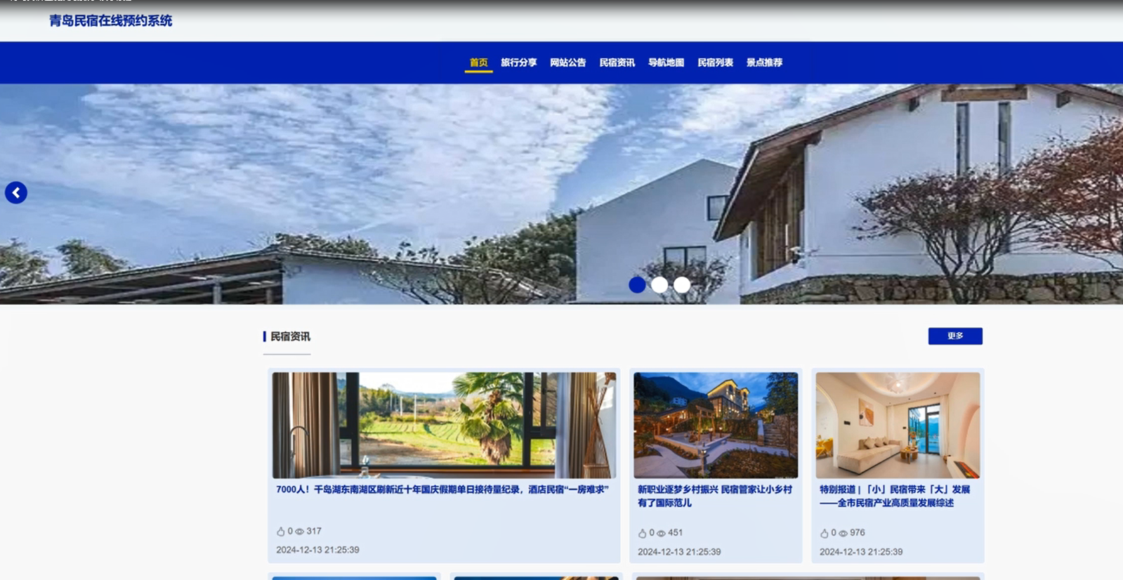 - 首页:用户可以查看首页展示的轮播图、网站公告、民宿资讯、民宿信息推荐等信息。在民宿信息推荐界面根据用户点击收藏记录进行推荐。