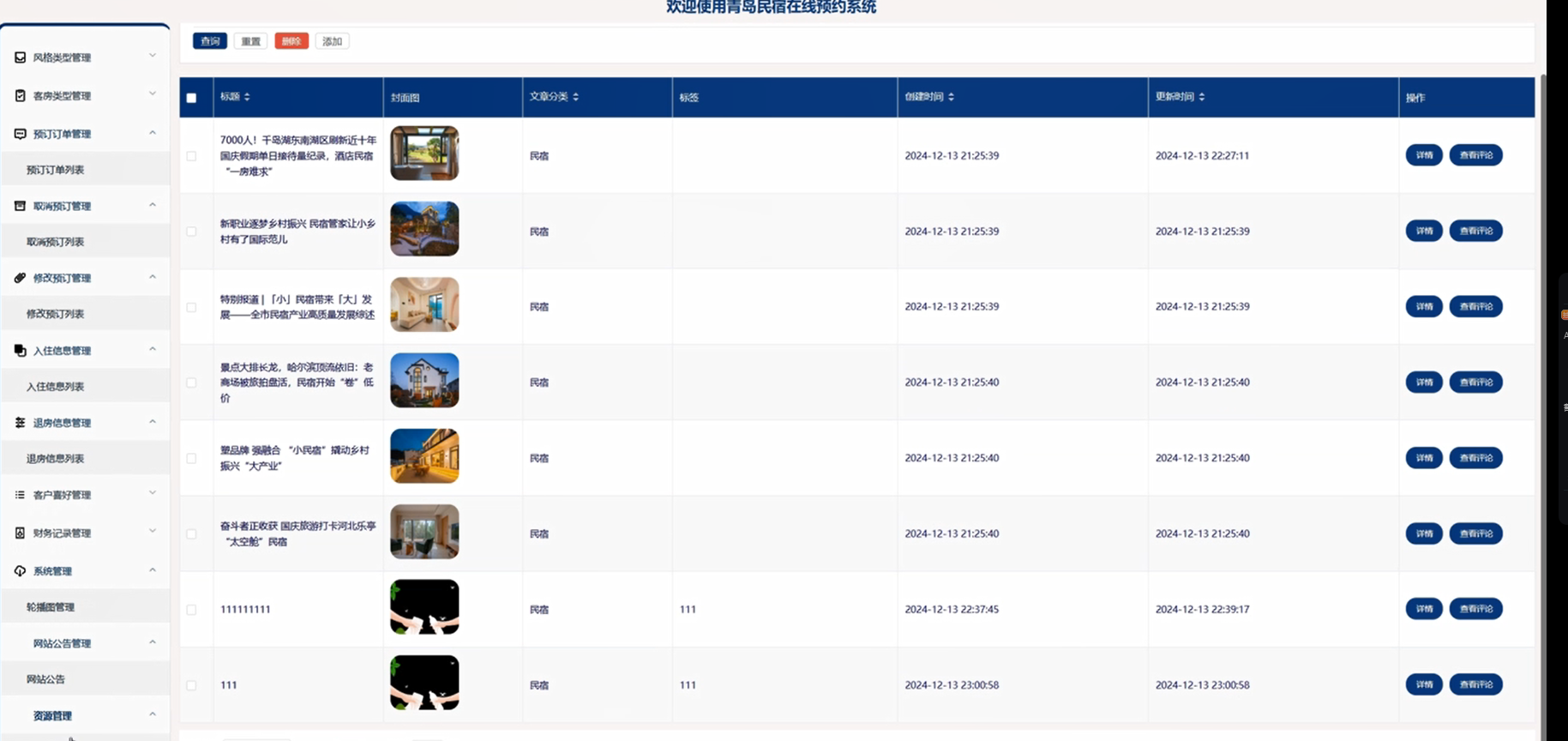 在该模块管理员对民宿资讯和资讯分类进行管控,可以对民宿资讯和资讯分类信息进行增删改查操作。如点击“民宿资讯”管理员可以查看资讯列表中某个资讯的详情和评论信息。以民宿资讯为例,其界面图如下图5.15所示。