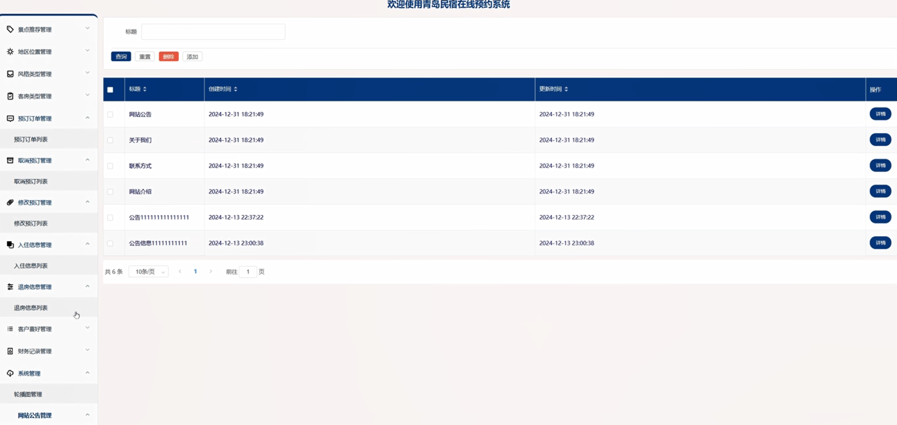 在该模块管理员可以进行民宿公告的创建、编辑、发布和删除等操作,以便向用户传达各种重要信息、公告、更新或事件等内容。民宿公告管理界面图如下图5.14所示。