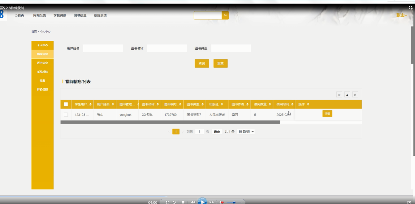 在个人中心学生可以查看自己当前及历史借阅记录,了解借阅的图书及其细节。借阅信息主界面图如下所示。