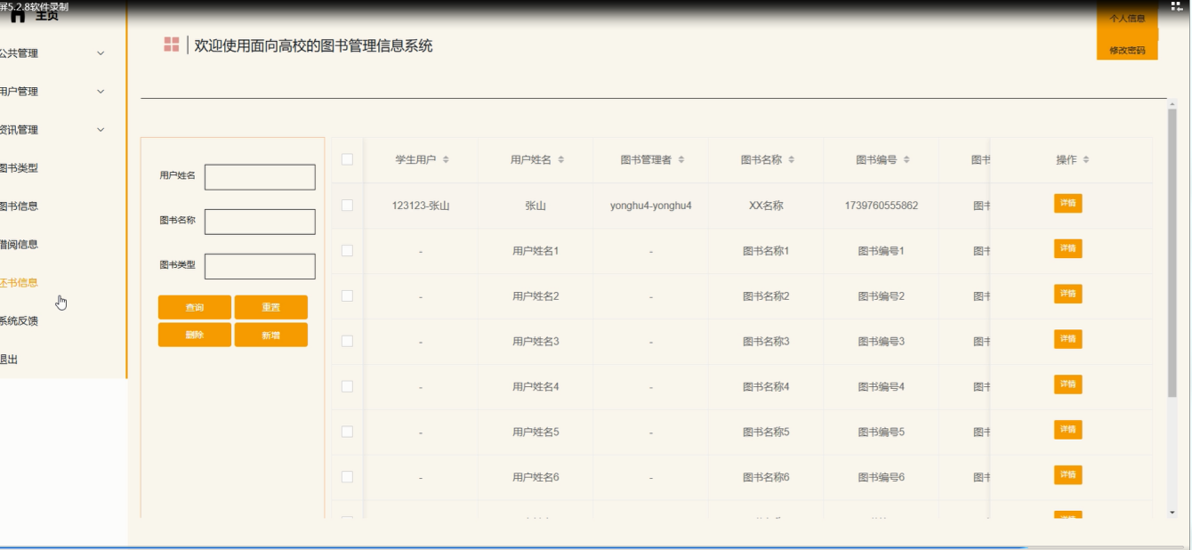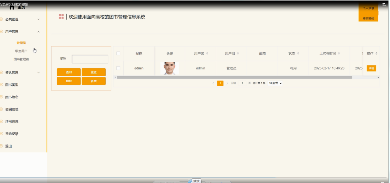 管理员可以管理系统中的所有用户,包括学生用户和图书管理者。此功能允许管理员添加、修改、删除用户信息,并根据需要调整用户权限,确保系统的安全性和可控性。