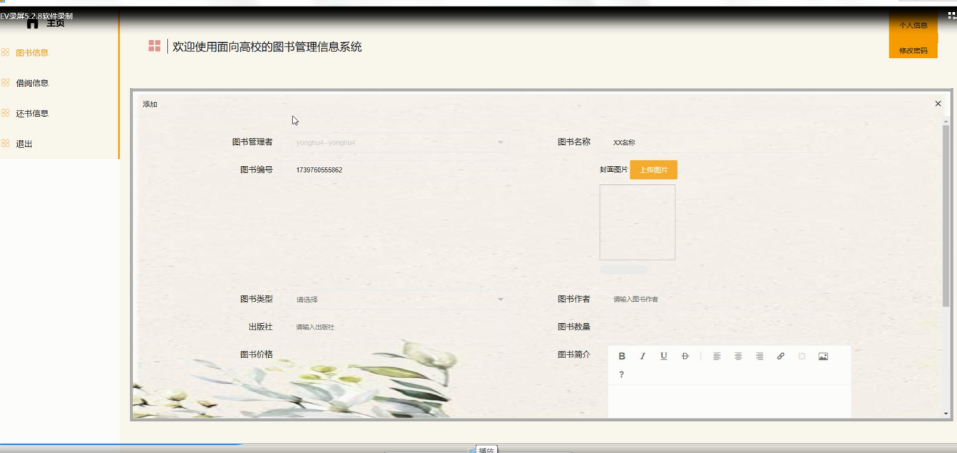 管理员可以执行多项操作,包括添加新书,以确保图书馆资料的及时更新。此外,管理员还可以修改已有书籍的信息,确保数据的准确性,涉及馆藏状态、书名和作者等的更新。对于不再使用或损坏的书籍,管理员可选择将其从系统中删除,以维护馆藏信息的准确性和整洁性。