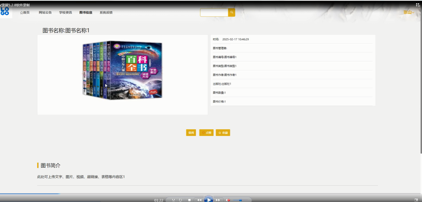 用户进入图书信息页面,浏览图书信息的图片、名称、描述等基本信息。通过搜索栏输入关键词或筛选条件,快速定位图书信息。可以进行借阅、点赞、收藏和评论。