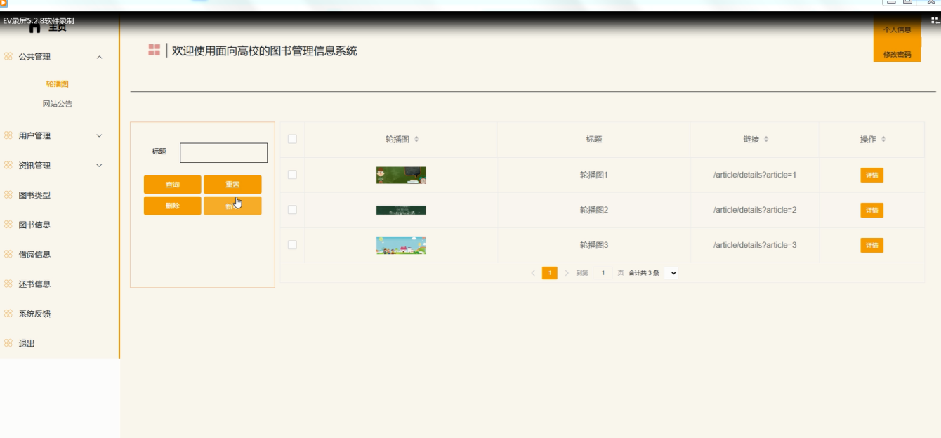 图书信息:浏览和搜索图书资源,了解可借阅的书籍信息。