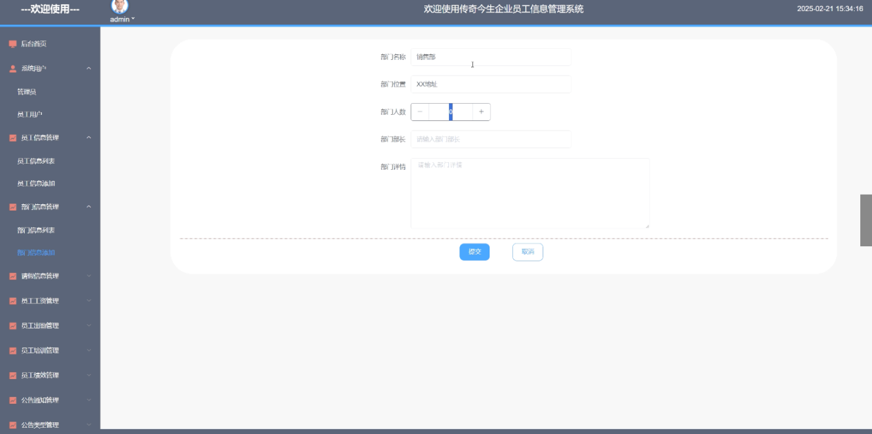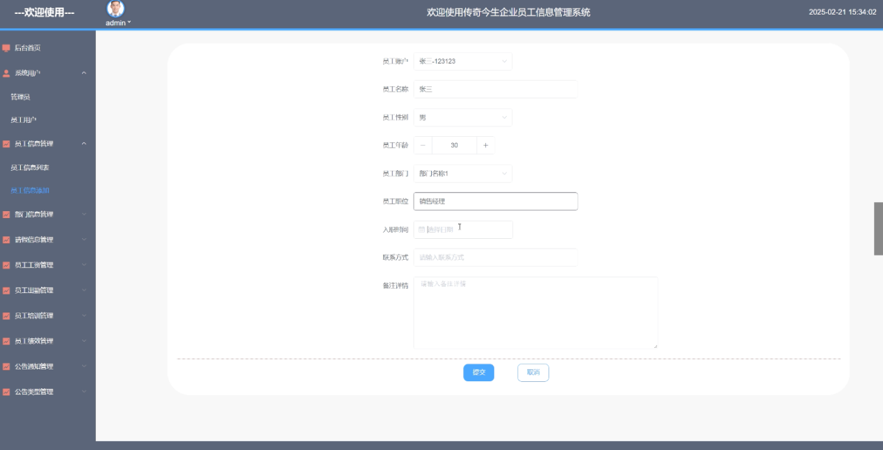 系统的前端采用了现代化的UI框架,操作简便,用户体验良好。后端采用了Spring Boot、MySQL等技术,保证了数据的高效存储与处理。同时,系统还具备良好的安全机制,确保员工信息的隐私性和数据的安全性。