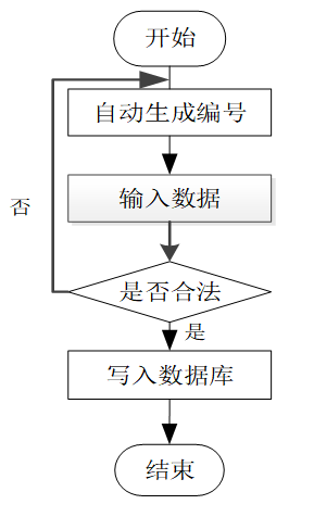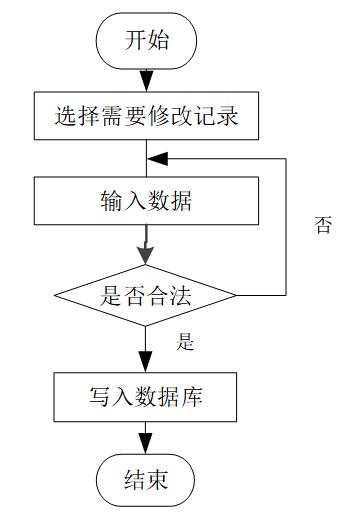 用户首先选择需要修改的记录,输入修改后的数据,系统判断输入数据是否合法。若数据不合法,提示重新输入;若数据合法,则将修改后的数据写入数据库,完成操作后流程结束。修改信息流程图如图4-4所示。