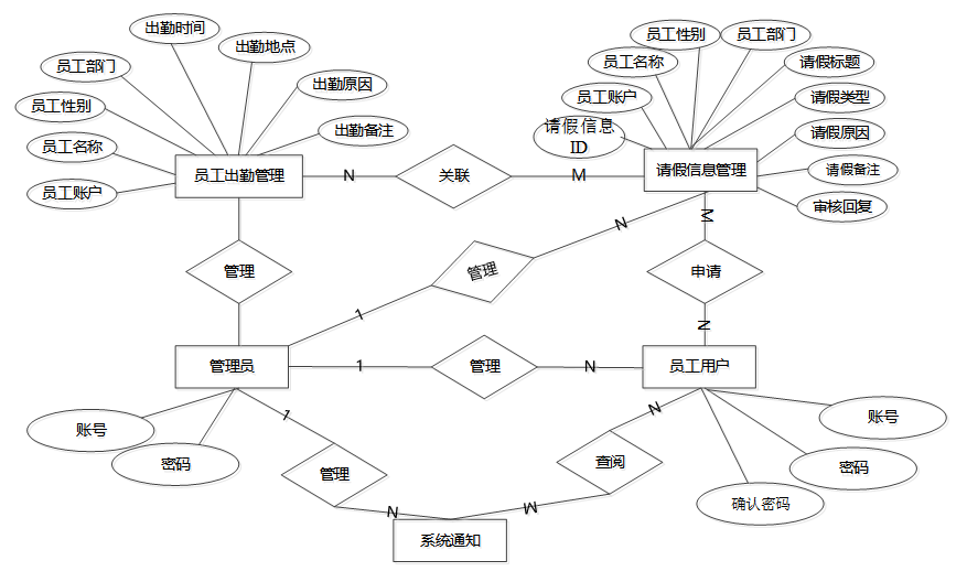 概念设计是数据库设计的第一步,其主要目标是对系统的数据需求进行全面的理解和抽象[11]。在这一阶段,通过建立实体-关系模型(ER模型)来识别系统中的关键实体、属性及其相互关系。概念设计的输出是一个清晰的ER图,作为后续数据库表设计的基础。以下将展示系统的全局E-R图以及各个实体的属性图。