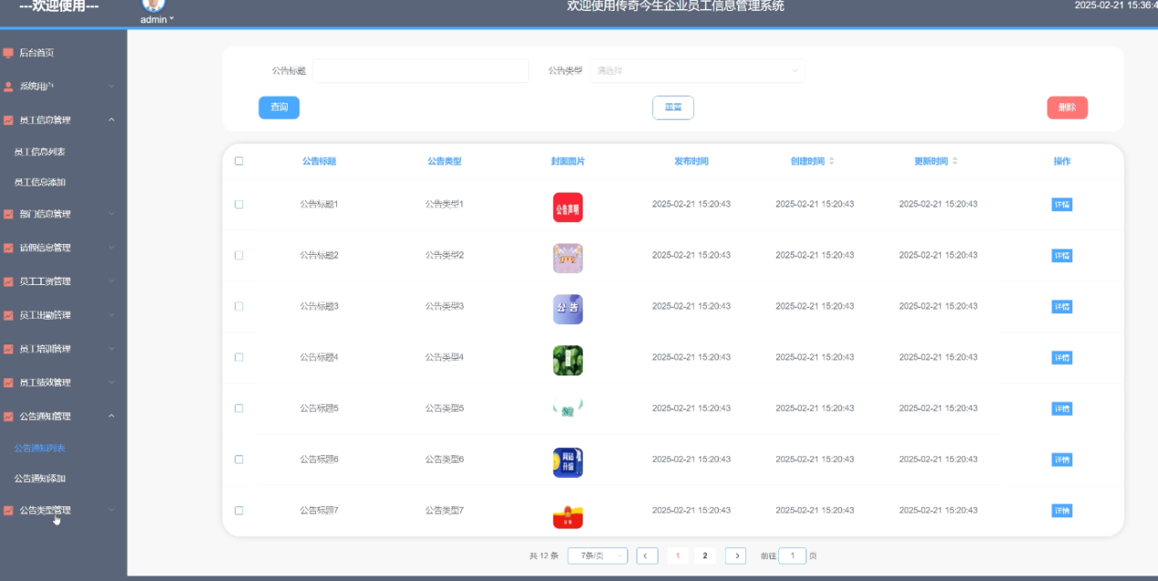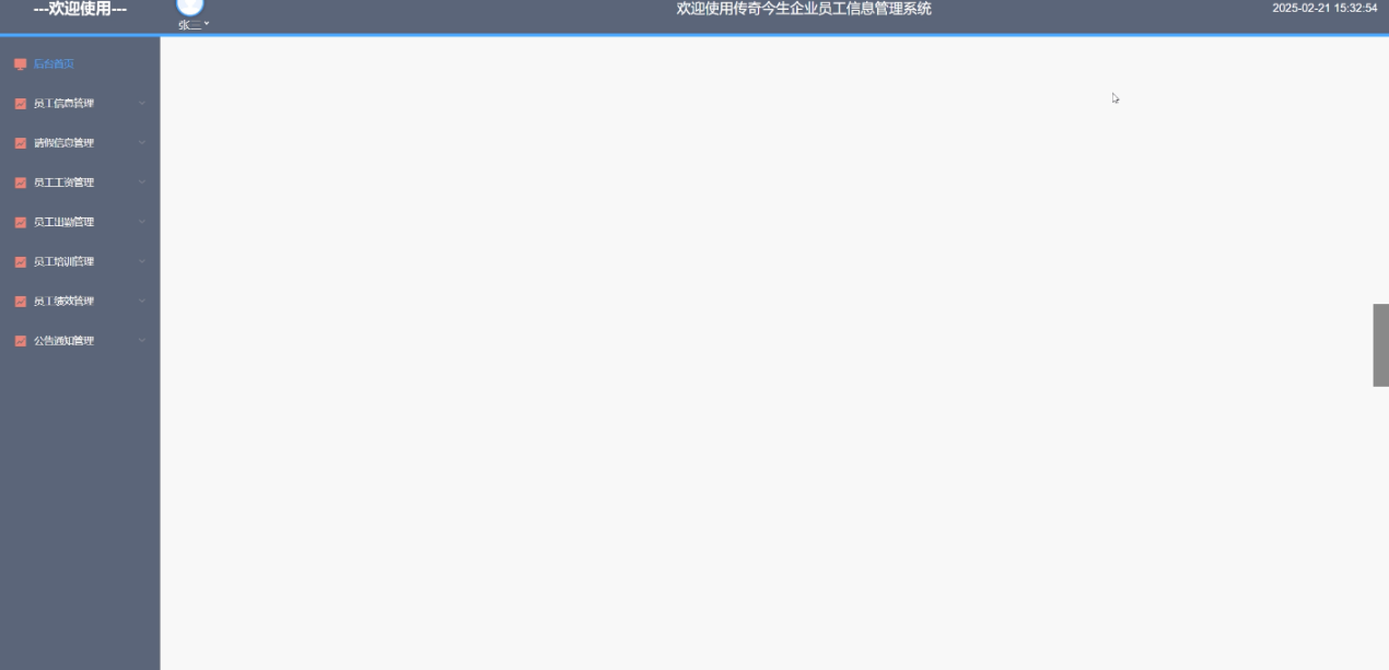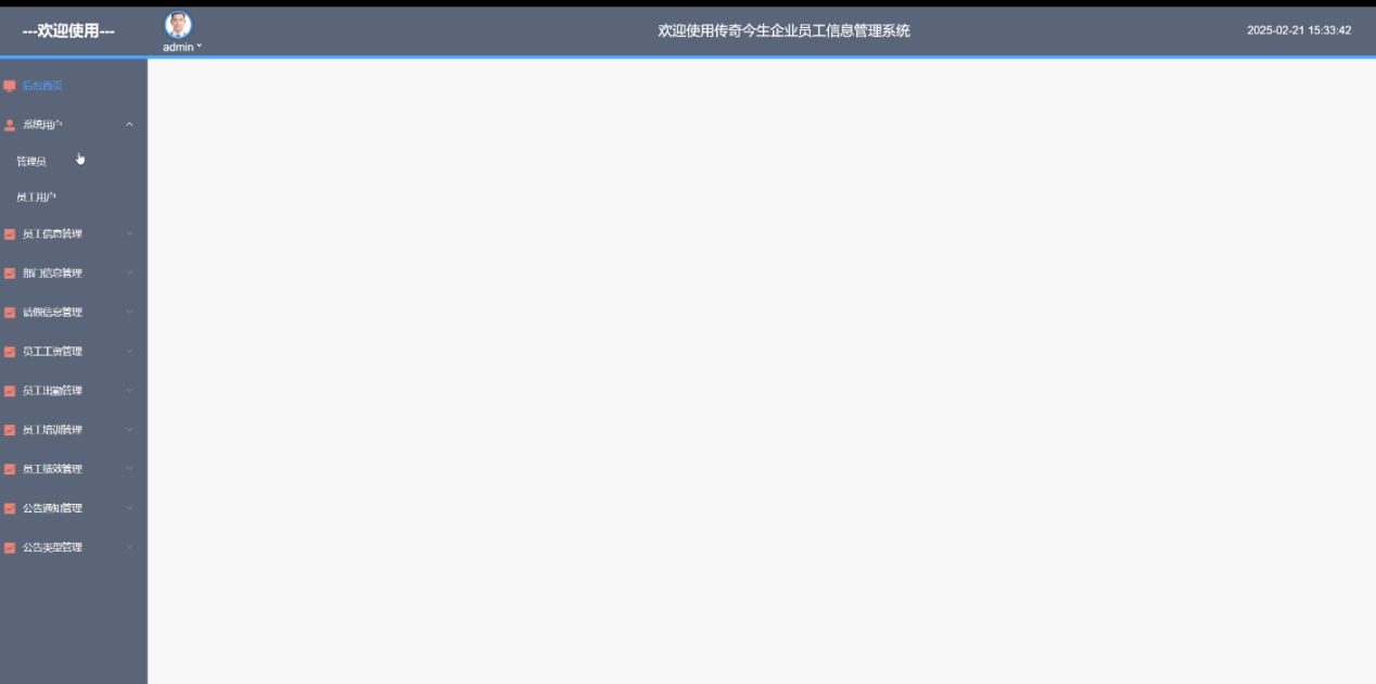 he administrator side has more comprehensive functions, covering the backend homepage, system user management, employee information management, department information management, leave information management, employee salary management, employee attendance management, employee training management, employee performance management, announcement notification management, and announcement type management. Administrators can comprehensively manage employee information, department settings, leave records, salary, performance, attendance, etc. through these modules, ensuring data accuracy and operational convenience.