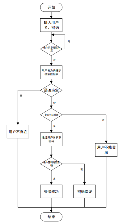 用户输入用户名和密码后,系统先检查输入是否为空,再验证用户名是否存在,若存在则通过用户名获取密码并校验。若密码正确则登录成功,否则提示密码错误。若用户名不存在或无法登录,提示用户操作无效。如图4-2所示。