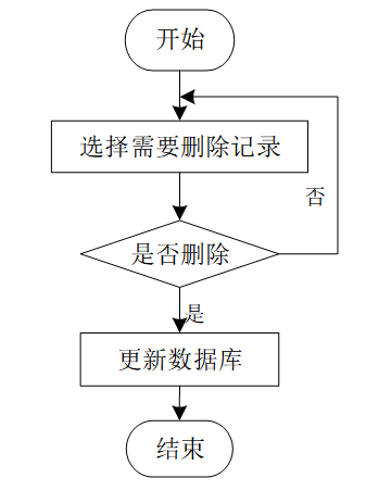 用户选择需要删除的记录后,系统判断是否确认删除。若未确认,返回选择环节;若确认删除,则更新数据库,删除对应记录,完成操作后流程结束。删除信息流程图如图4-5所示。