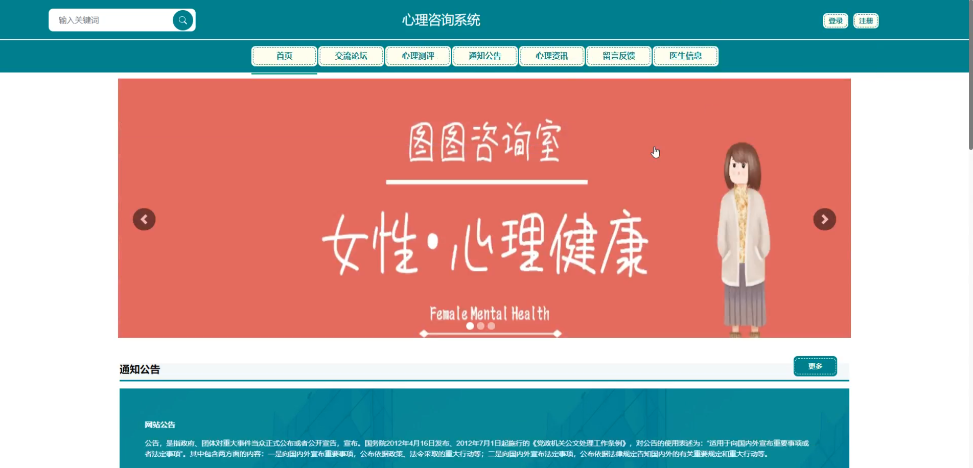 基于springboot和vue的心理咨询系统前台的研究内容主要包括普通用户注册登录、首页浏览、交流论坛与其他用户进行互动交流,可发布帖子;提供心理测评,可浏览试题列表,选择试卷进行答题提交测评;查看通知公告和心理资讯,提供留言反馈模块,可点击留言填写内容提交反馈;浏览医生信息,可以选择医生,查看详情,点击咨询可提交咨询信息;在我的账户可对个人资料和密码进行更新;在个人中心可以查看提交心理咨询列表、详请(如诊断状态、医生回复),管理交流论坛发布的内容,查看心理测评作答时的错题,以及对收藏和评论的管理。针对心理医生,其注册后可登录系统前台和后台,后台功能与前台个人中心的功能一样,在这主要进行前台功能介绍。心理医生登录系统前台,可在我的账户对个人资料和密码进行更新;可以在交流论坛发布帖子内容,与其他用户进行互动交流,可进行点赞、收藏和评论;可浏览查看心理测评、通知公告、心理资讯和医生信息,还可在留言反馈模块,点击留言填写内容提交反馈;在个人中心,可以对自己的医生信息进行管理,可以添加、删除内容,在心理咨询可查看用户提交的心理咨询信息并进行诊断、回复,管理交流论坛发布的内容,查看错题记录,以及对收藏和评论的管理。针对管理员,登录后台可以查看数据分析图表以及提供全面的管理功能,主要包括对轮播图、通知公告、心理资讯、系统用户、交流论坛管理、医生信息、留言管理、心理测评以及个人信息密码管理等功能模块。系统致力优化用户体验,设计用户友好的界面和功能,保证使用者可以方便快捷使用系统。