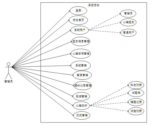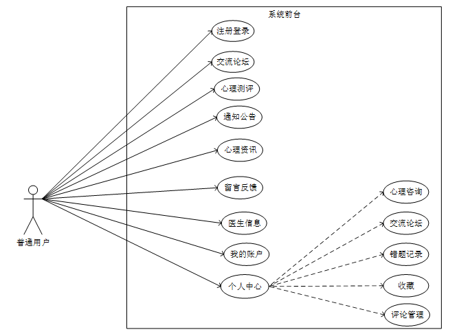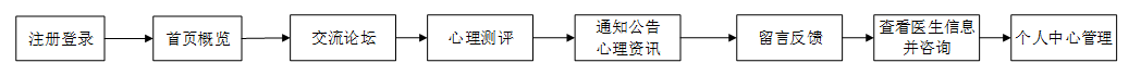功能需求:包括用户注册登录、交流论坛与他人互动交流、在线进行心理测评、浏览通知公告和心理资讯、查看医生信息并可进行咨询以及个人中心管理等。