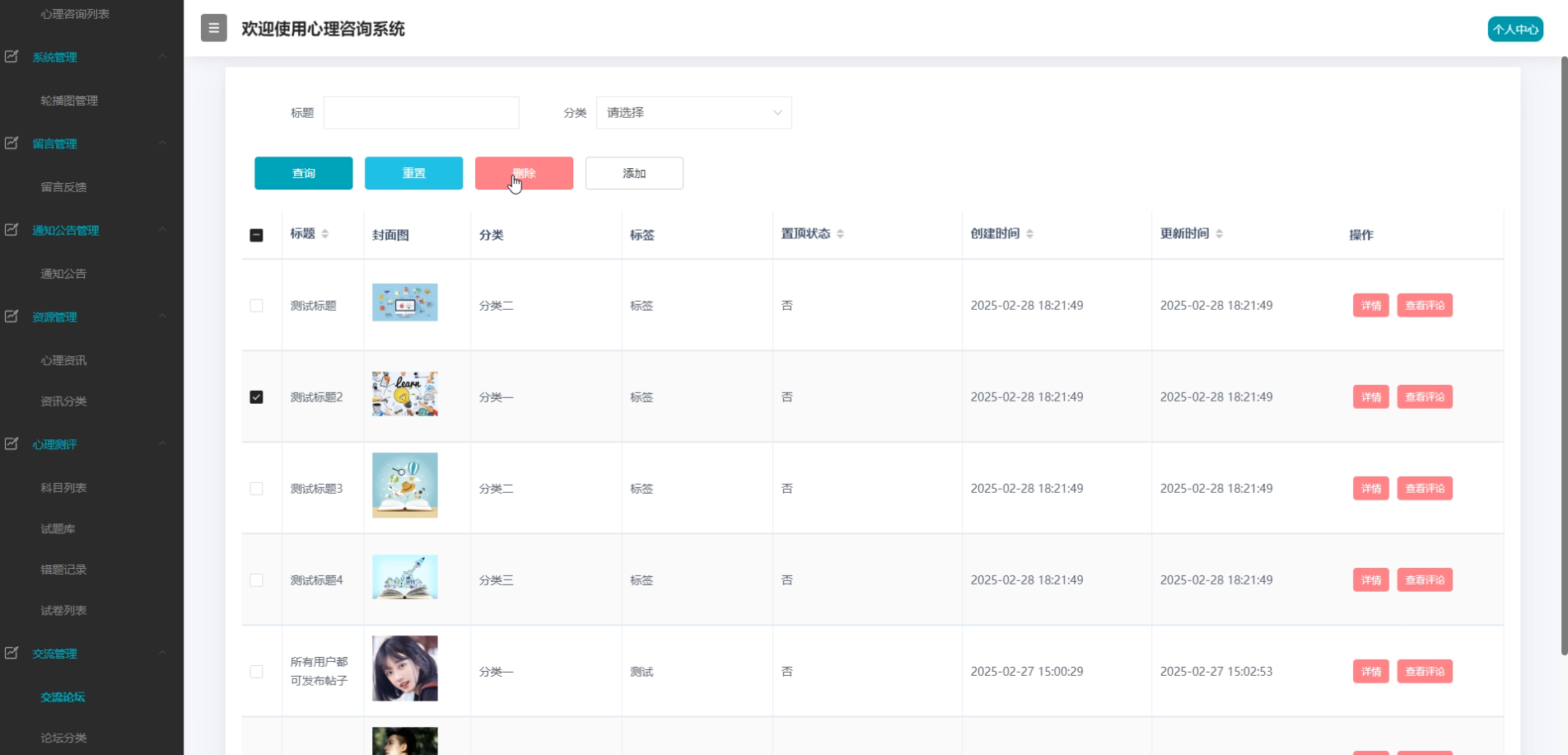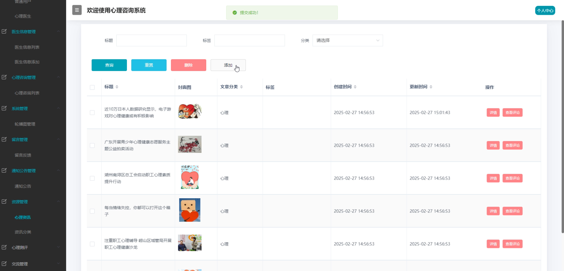 管理员在资源管理模块中,拥有对心理资讯及资讯分类的全面管理权限。可以随时查看现有的心理资讯内容和评论;同时,也能够根据需求添加新的心理资讯,确保信息的时效性和丰富性。此外,管理员还可以对不再相关或过时的资讯进行删除操作,以保持资讯库的整洁和有序。另外,可对资讯分类进行增删改除操作。资源管理界面如图5-12所示。