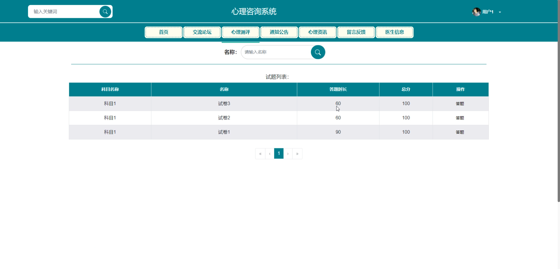 心理测评:普通用户可点击心理测评模块,查看试卷列表,选择试卷可进行作答,提交答卷。