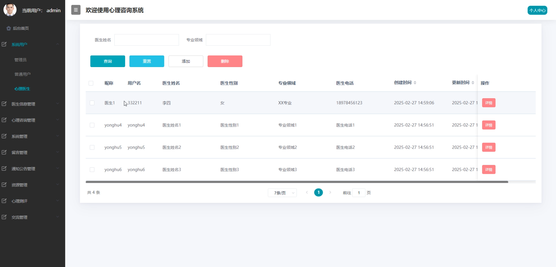 管理员在系统用户模块,可以对系统所有的用户进行管理,包含管理员、普通用户和心理医生,可以查看用户详细信息,可进行添加、修改和删除操作。系统用户界面如图5-10所示。