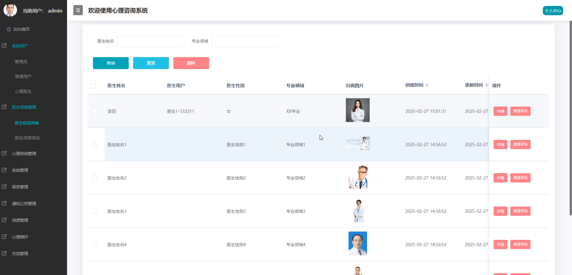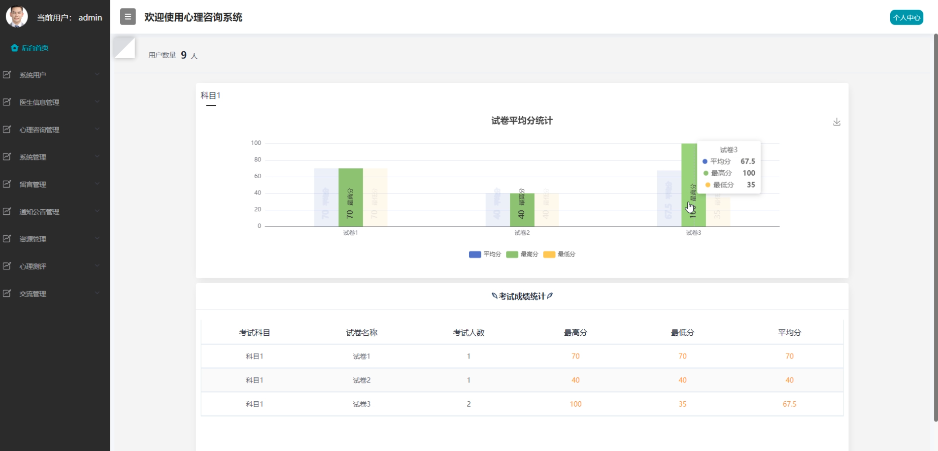 管理员功能,提供全面的管理功能,可以查看系统数据分析,对轮播图、通知公告、心理资讯、系统用户、交流论坛、医生信息、留言管理、心理测评、个人信息密码管理以及数据备份和恢复等功能。