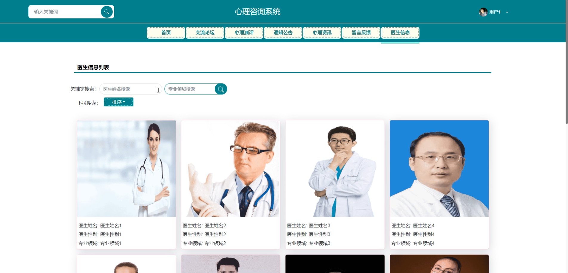 医生信息:查看系统中的医生信息,可以按心理医生姓名、专业领域进行搜索查看,可查看心理医生详细信息,可进行点赞、收藏和评论操作。也可点击页面的咨询按钮,提交咨询单。