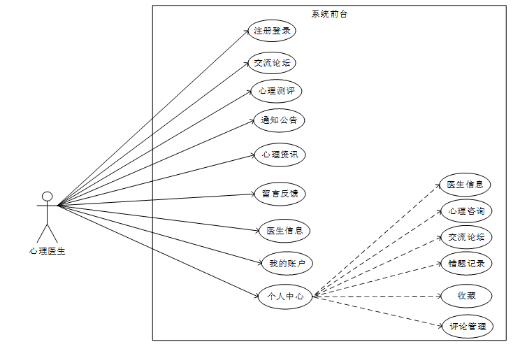 心理医生功能,可以进行注册登录,可登录系统前台和后台,在前台,心理医生可在交流论坛发布帖子与其他用户进行交流互动;对个人信息和密码进行管理,可以点击留言反馈模块,填写内容提交反馈信息;可以在个人中心的医生信息中查看管理个人的医生信息内容;查看普通用户提交的咨询信息并进行诊断回复;查看、管理在交流论坛发布的帖子;查看错题记录;管理收藏;查看评论记录和被回复内容,可点击跳转链接至文章页面,也可对评论进行删除操作。