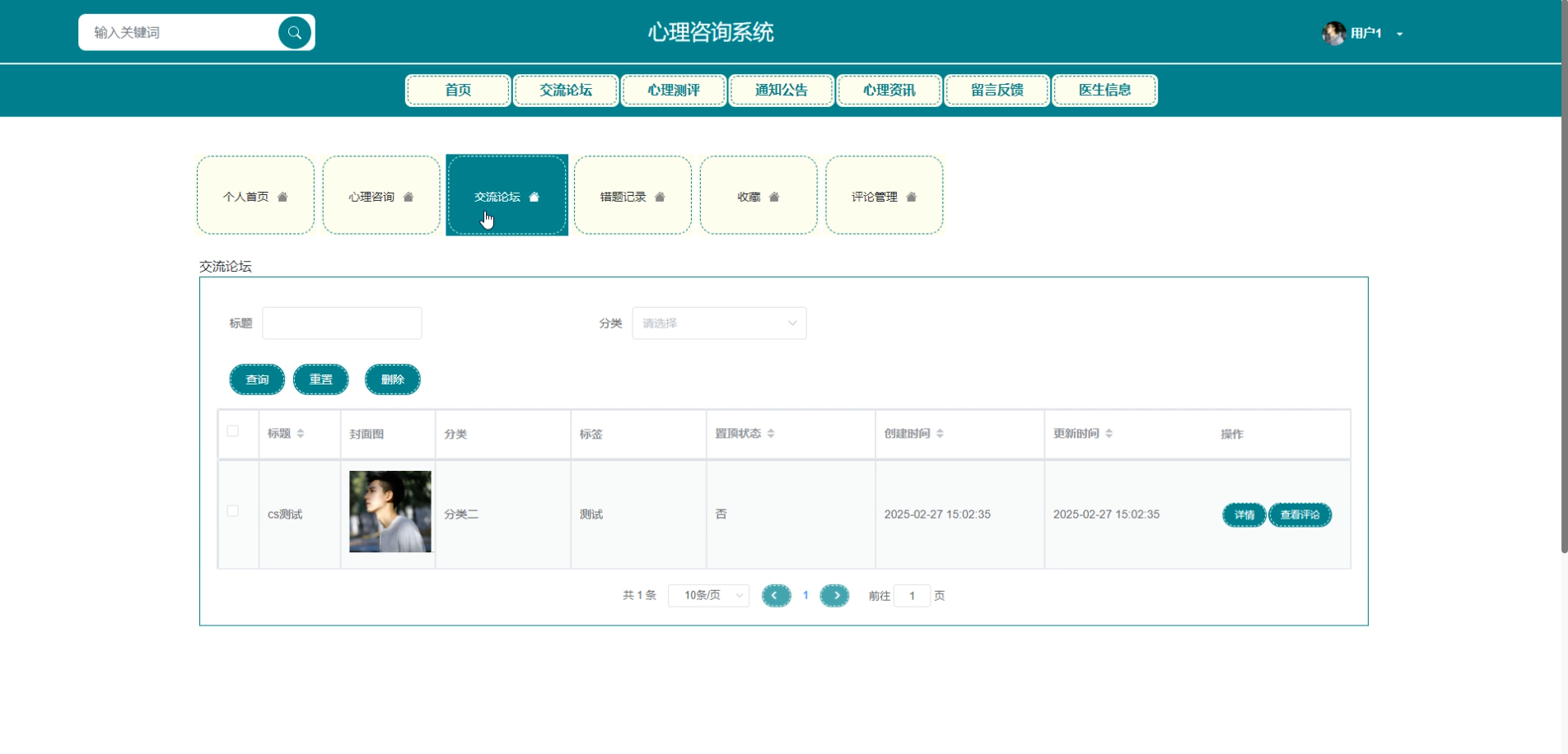 心理医生在系统前台,可以在个人中心进行医生信息的管理和添加,查看普通用户提交的心理咨询信息,并进行诊断回复,管理交流论坛发布的内容,查看错题记录,管理收藏和评论。普通用户在个人中心,可以查看提交的心理咨询的回复情况,管理交流论坛发布的内容,查看错题记录,管理收藏;查看评论记录和被回复内容,可点击跳转链接至文章页面,也可对评论进行删除操作。