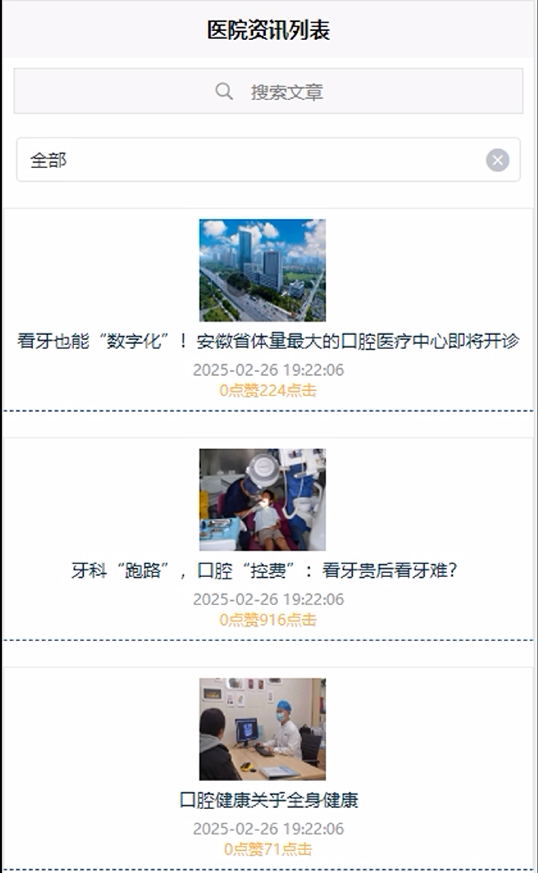 (6)医院资讯:用户点击可通过局部搜索进行浏览医院资讯,同时可对咨讯进行点赞、收藏和评论。