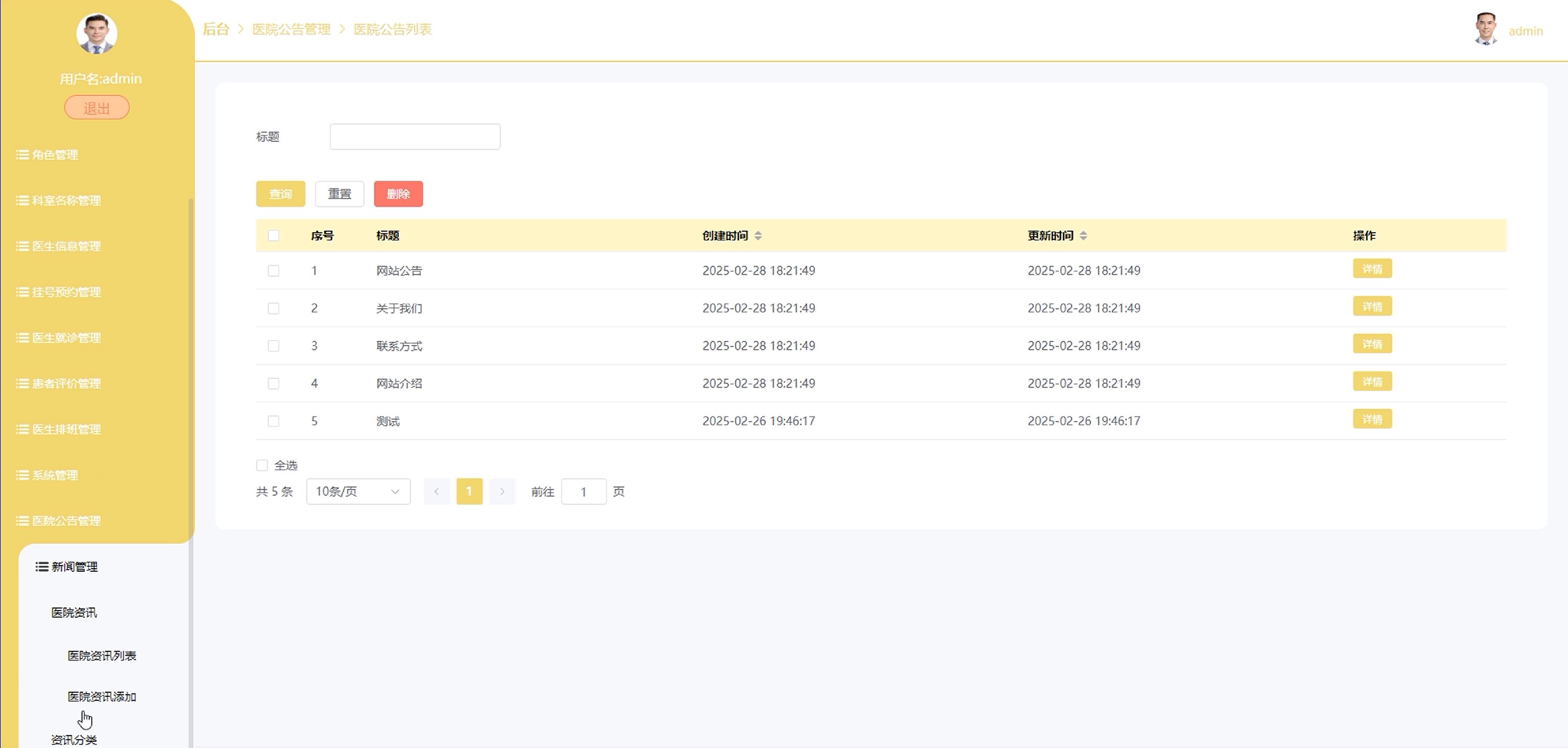 (5)医生信息管理:管理员点击可查看医生信息列表,同时可对医生信息进行增删改查。