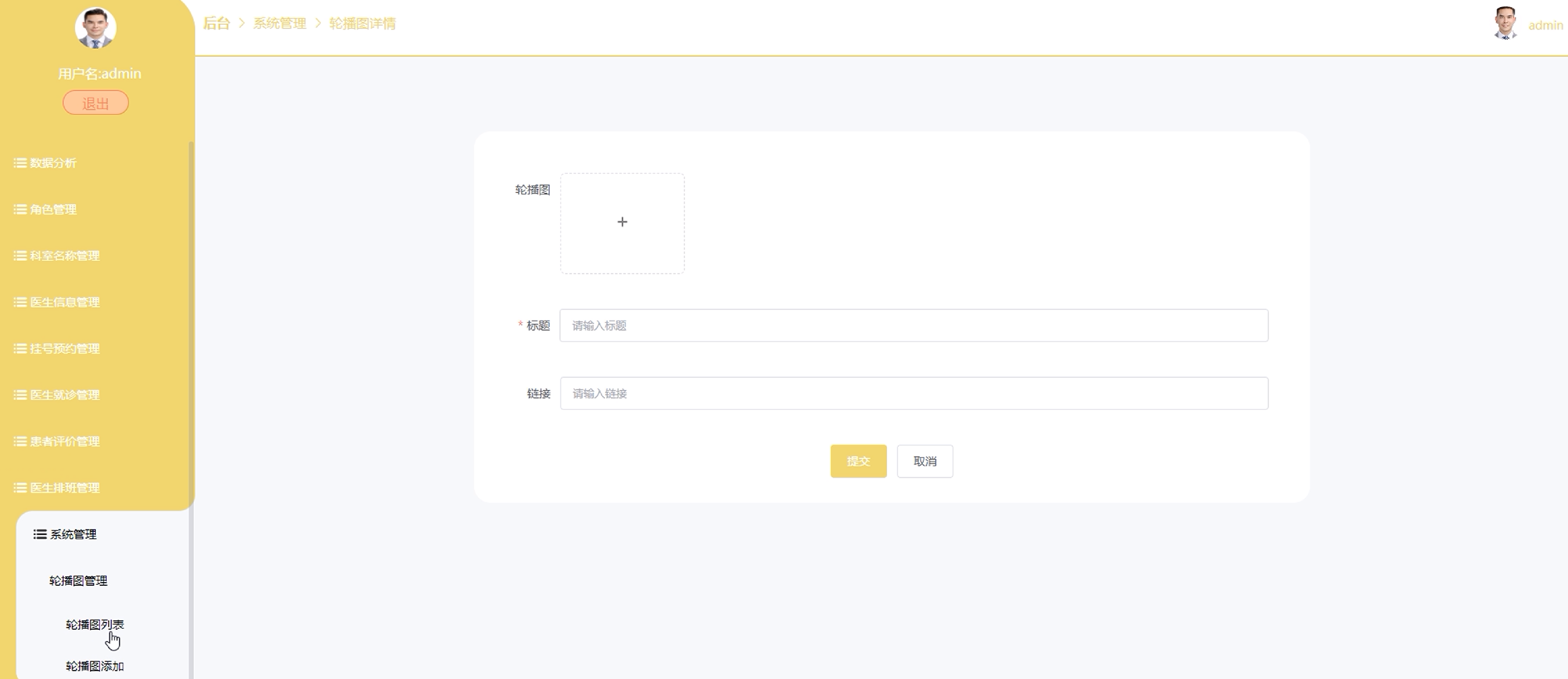 (10)系统管理:管理员点击可查看轮播图管理;如需添加新的轮播图,可点击“轮播图添加”,上传图片,输入标题和链接,点击“确认”按钮进行添加;同时可对轮播图进行增删改查。