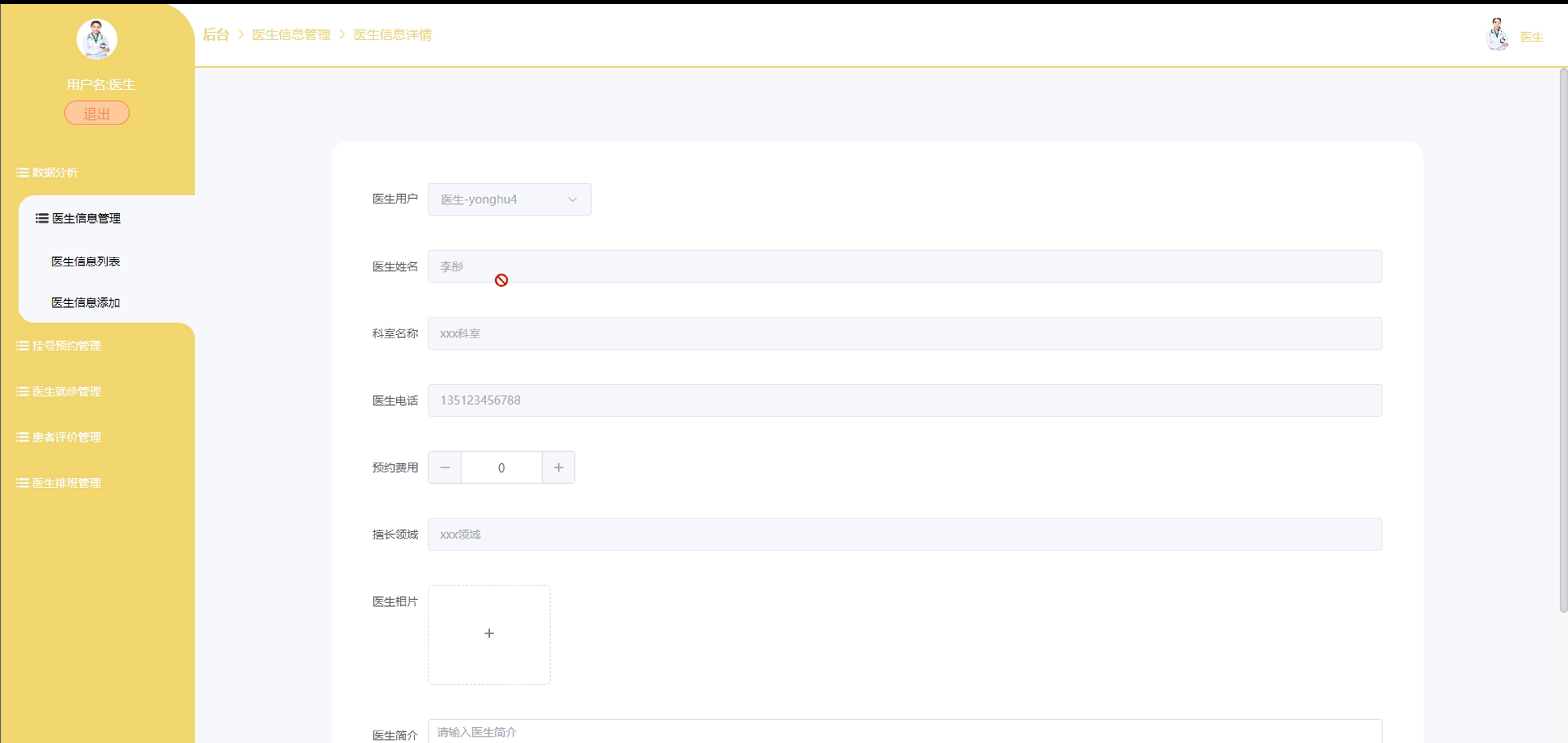 医生信息管理:医生信息管理包含医生信息列表和医生信息添加;点击进入“医生信息添加”可填写相关信息,包括医生用户、医生姓名、科室名称、医生电话、预约费用、擅长领域、医生相片和医生简介。界面图如下。
