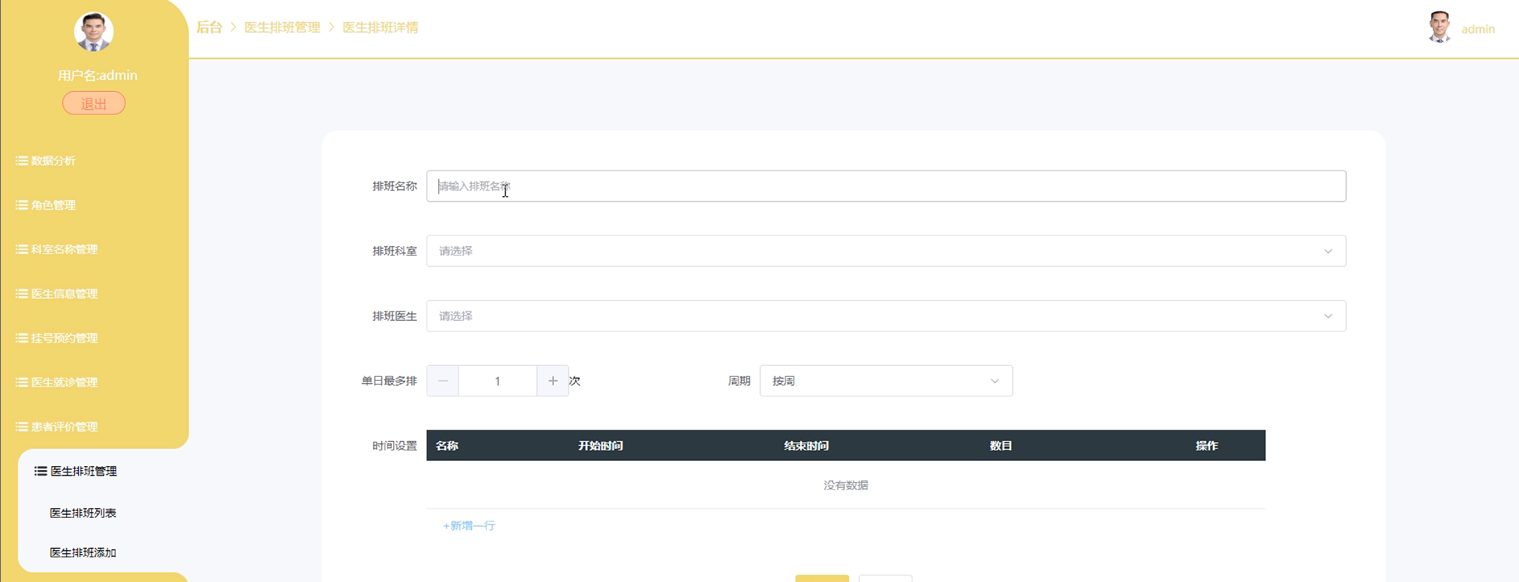医生排班管理:管理员点击可查看医生排班列表和医生排班添加;点击进入“医生排班添加”可填写相关信息,包括排班名称、排班科室、排班医生、单日最多排和时间设置。界面如下图所示。
