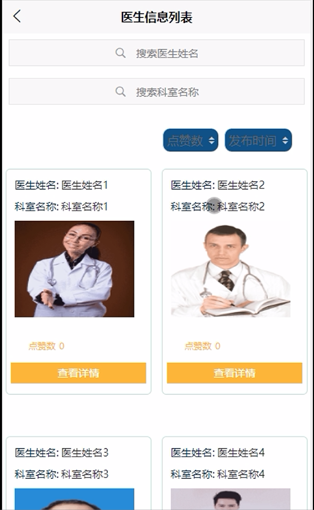 医生信息:用户点击可通过搜索医生姓名和课时名称进行查看医生信息列表,点击进入需要挂号的医生可查看详情信息,可对医生信息进行点赞、收藏和评论。可点击“挂号”按钮填写挂号信息,包括预约时间、预约时段、病情描述。界面图如下。