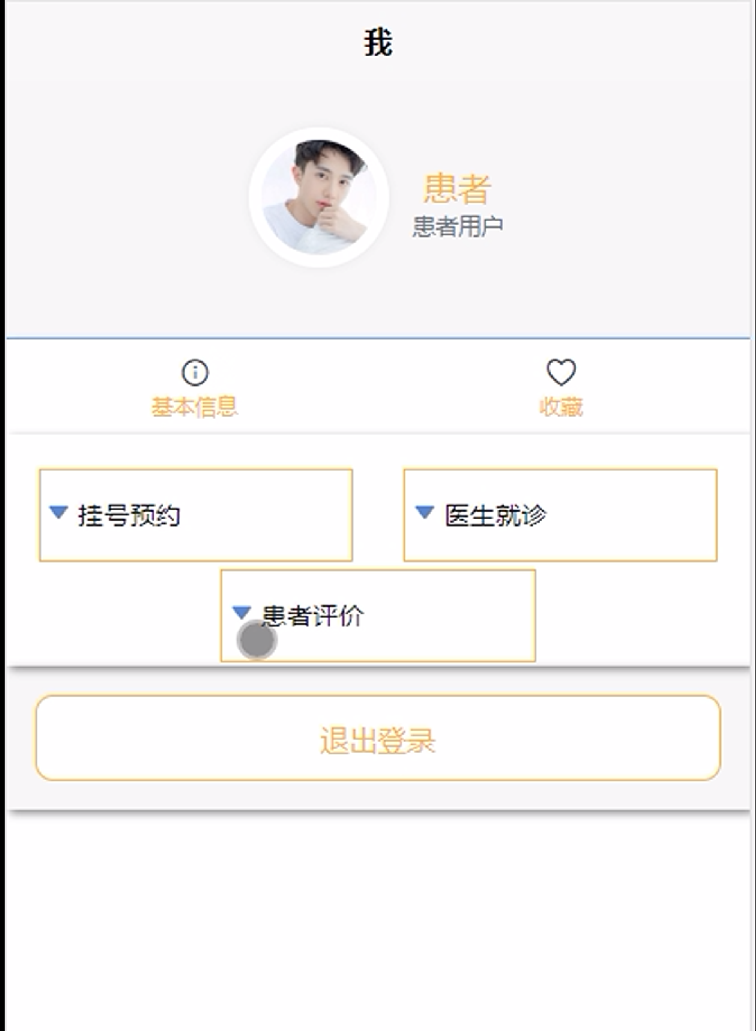我的:我的包含多个功能模块,包括基本信息、收藏、挂号预约、医生就诊、患者评价。点击进入“基本信息”可对个人信息和个人密码进行修改。点击进入“挂号预约”可查看预约列表,可对预约费用进行支付。点击进入“医生就诊”可查看就诊详情,同时可对就诊费用进行支付;点击进入“患者评价”可填写评价信息。点击进入“收藏”可查看历史收藏信息,可对收藏信息进行查看或者删除。界面图如下。