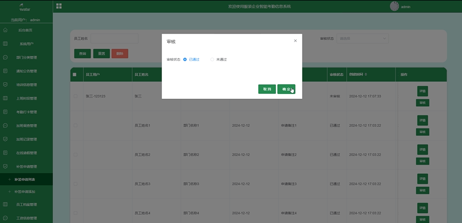 员工用户可以查看自己的所有补签申请信息,并可进行申请操作,管理员负责审核所有的补签申请。管理员审核补签申请界面、员工添加补签申请如下图: