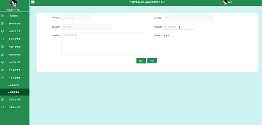 补签申请管理:当员工因特殊原因未能按时打卡时,可以通过此功能提交补签申请,等待上级审核。