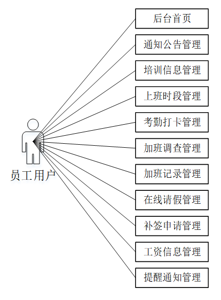 员工用户模块功能有:后台首页、通知公告管理、培训信息管理、上班时段管理、考勤打卡管理、加班调查管理、加班记录管理、在线请假管理、补签申请管理、工资信息管理、提醒通知管理。
