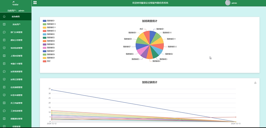 管理员登录系统后首先进入后台首页界面。管理员除后台导航外,可在后台首页查看加班统计数据分析图表。