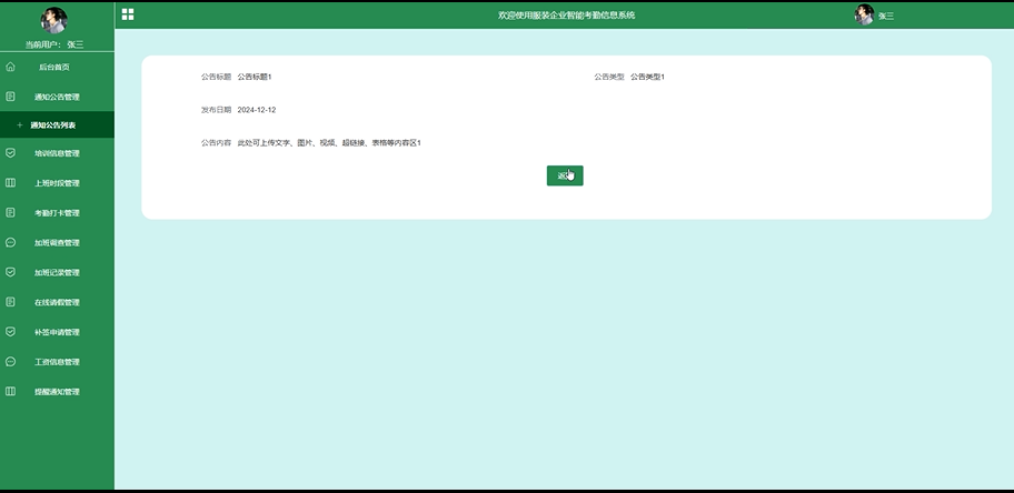 通知公告模块是系统中的重要组成部分之一,员工用户可查看管理员发布的所有通知公详情。