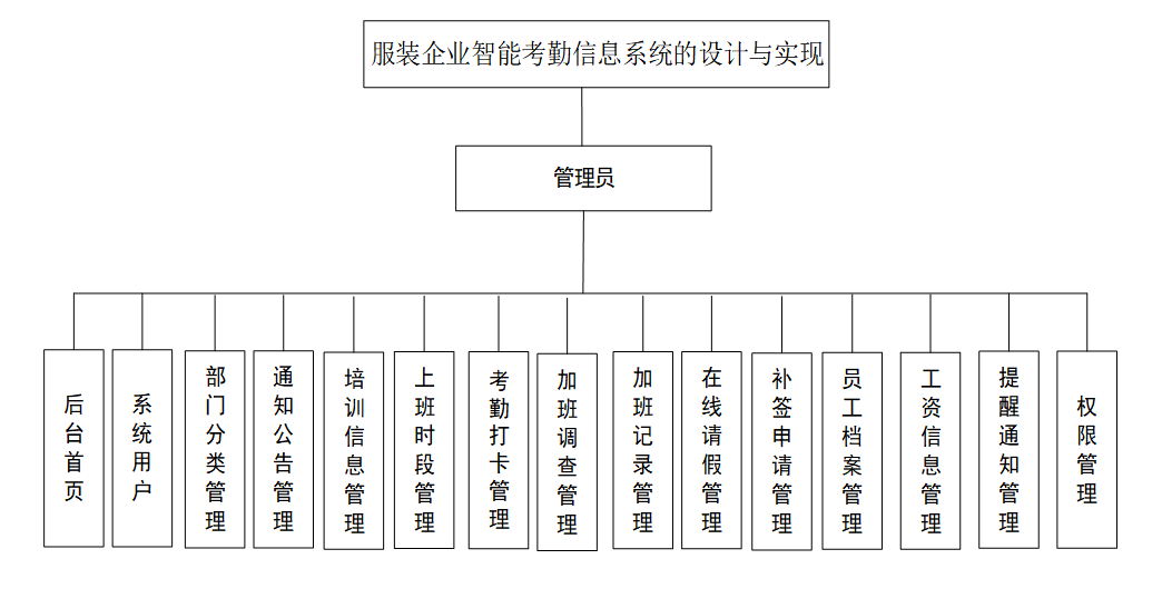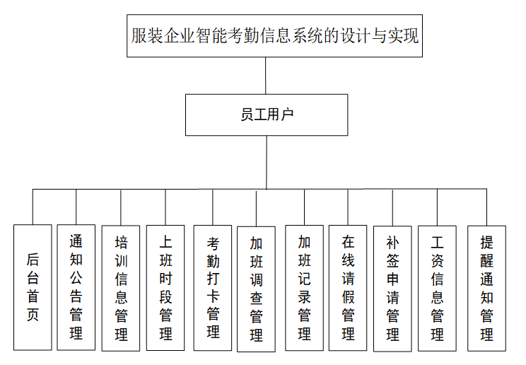 根据用户对系统的需求,要求系统简单操作,能够准确,完整的对信息进行管理。服装企业智能考勤信息系统在对需求做解析后,整个系统主要分为两大部分:管理员和员工用户模块。每个模块下的功能不一样。对功能做出如下说明: