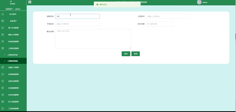 上班时段管理模块是系统中重要组成模块之一,用户可以查看管理员添加的上班时段详情,并可进行打卡操作。例如,管理员添加上班时段界面如下图: