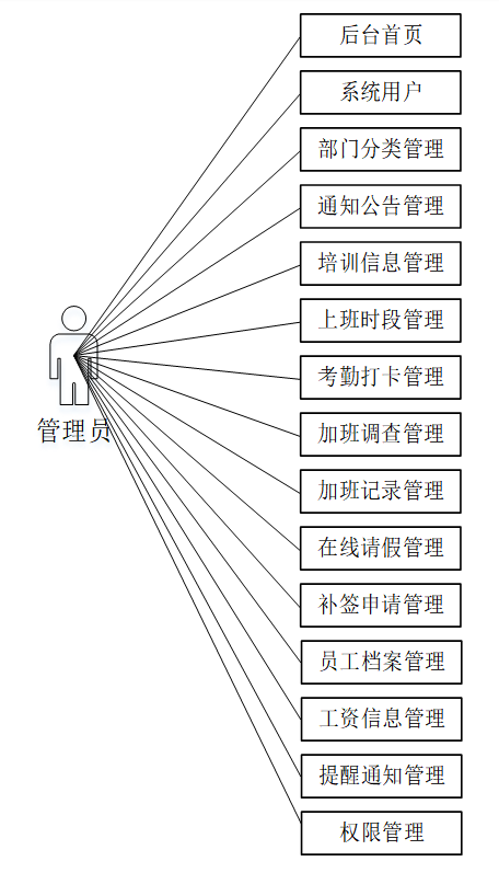 管理员模块功能有:后台首页、系统用户、部门分类管理、通知公告管理、培训信息管理、上班时段管理、考勤打卡管理、加班调查管理、加班记录管理、在线请假管理、补签申请管理、工资信息管理、提醒通知管理、权限管理。