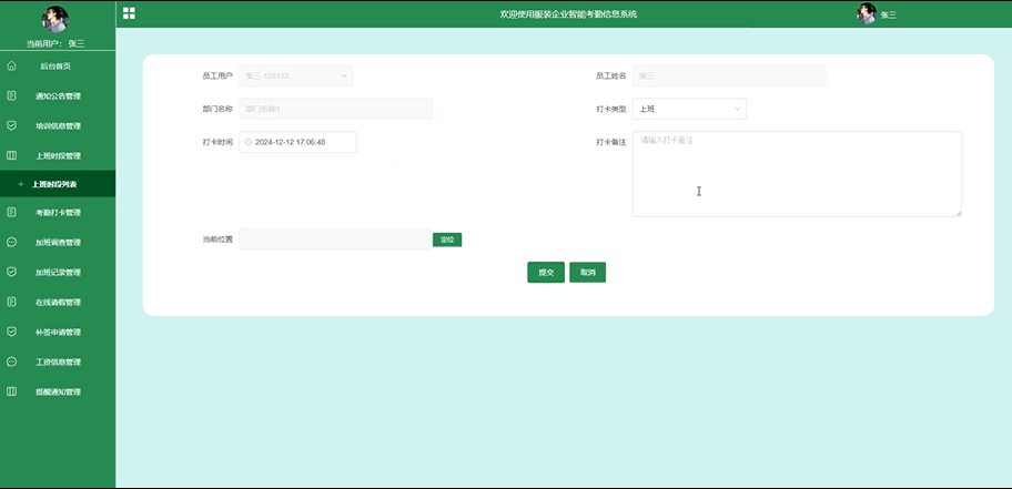考勤打卡管理:通过系统进行上下班打卡操作,记录每日出勤情况,并能查看个人的考勤记录。