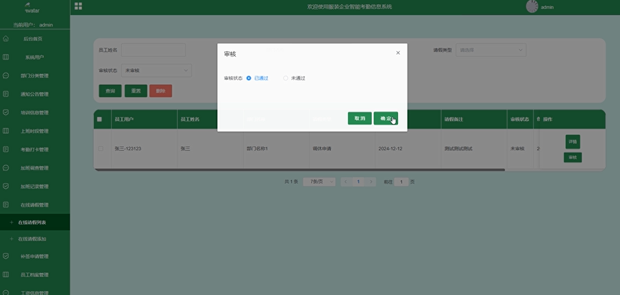例如,管理员审核在线请假界面、员工用户在线请假界面如下图: