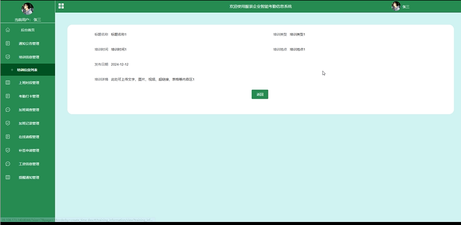 System function covers the training information management, working time management, attendance clock management, overtime investigation management, overtime record management, online management, sign application management, salary information management, user login registration and background user management, special emphasis on the security and stability of the system, through the user rights control, data encryption and abnormal processing measures, to ensure transaction security and data integrity. Through this system, it can effectively improve the enterprise management level, reduce the labor cost, and enhance the market competitiveness of enterprises. Through online leave, notice, attendance record query and other functions, employees can more convenient attendance management, improve work efficiency. At the same time, the transparency of the system enhances the employees' trust in enterprise management, thus enhancing the sense of belonging and work enthusiasm of employees.