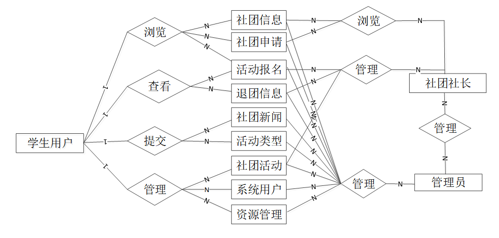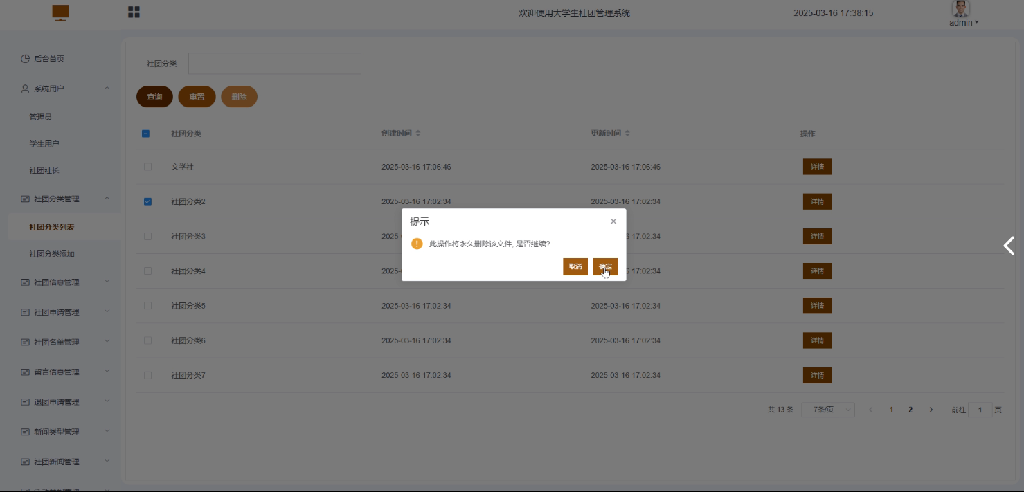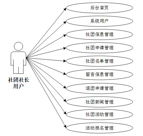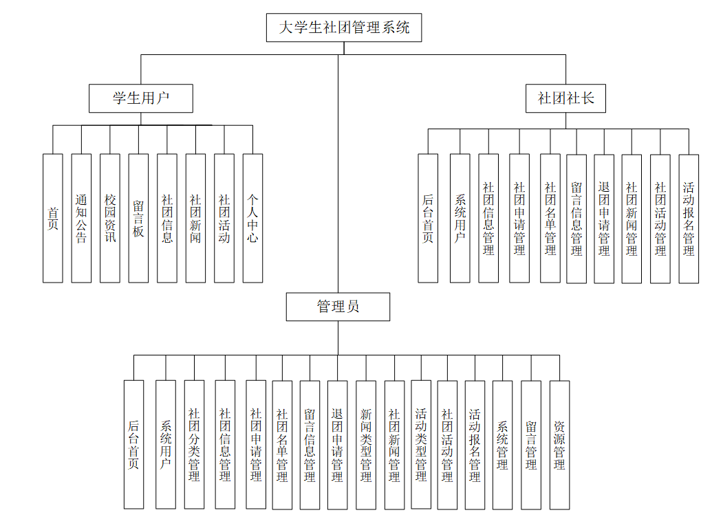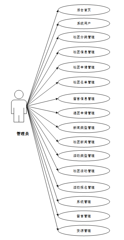 管理员可管理系统用户(管理员、学生用户、社团社长)、社团分类管理、社团信息管理、社团申请管理、社团名单管理、留言信息管理、退团申请管理、新闻类型管理、社团新闻管理、活动类型管理、社团活动管理、活动报名管理、系统管理(轮播图)、留言管理、资源管理。